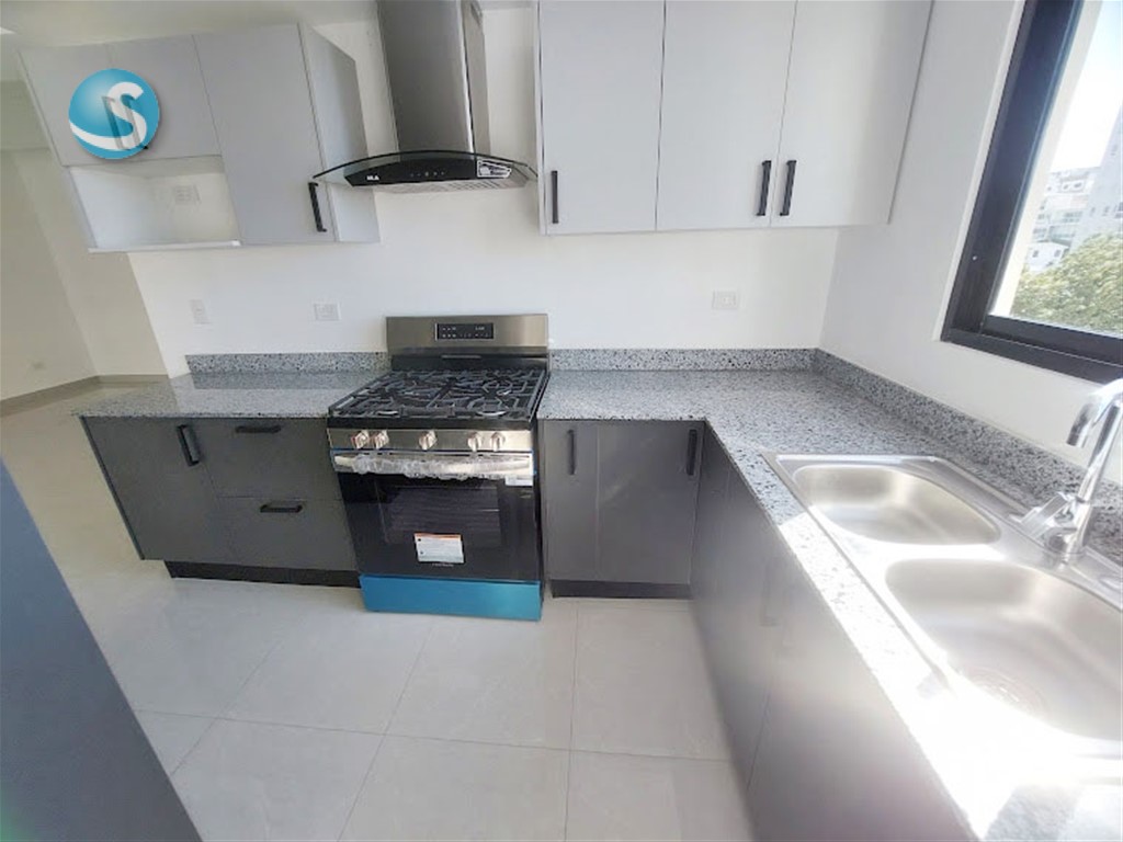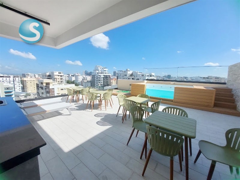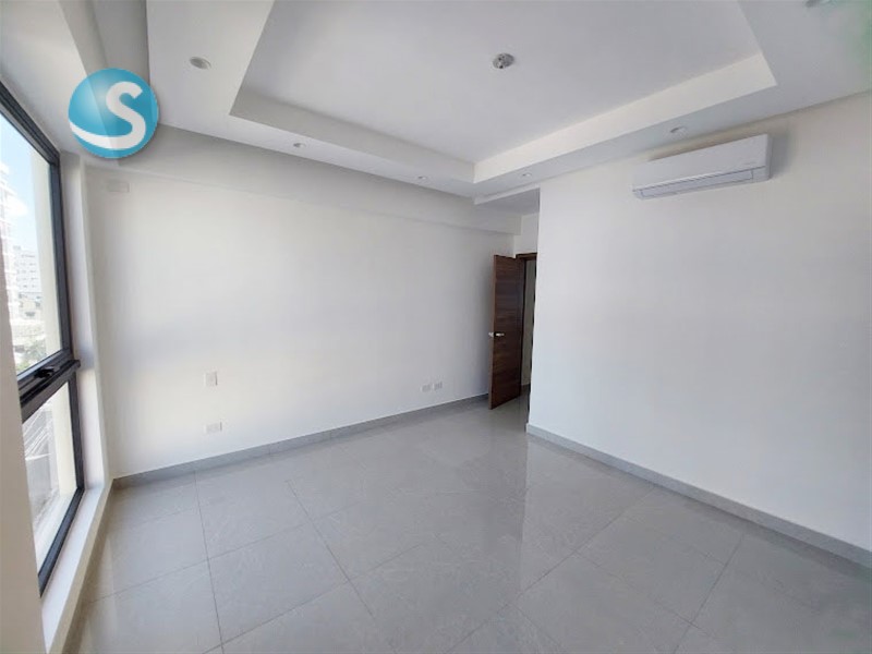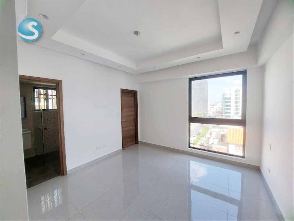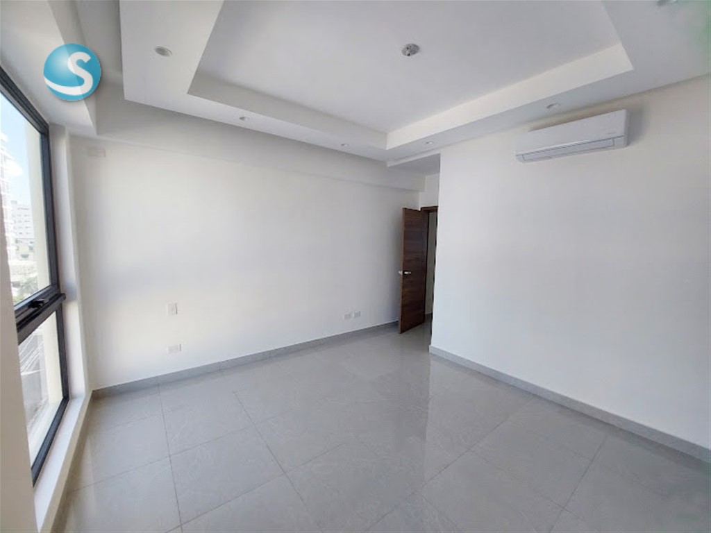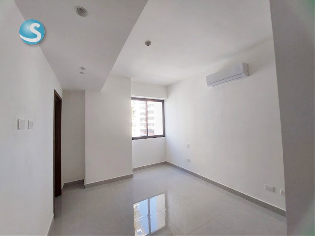 Ubicado en el 5to. piso, cuenta con balcón, sala, comedor, cocina equipada con electrodomésticos nuevos de primera, aires en las dos habitaciones, cada una con su baño y la principal con walk-in closet. Tiene también su área de lavado con lavadora-secadora, cuarto de servicio y dos parqueos techados lineales. Terminación de primera con techos en yeso con luces empotradas en sala-comedor y habitaciones.