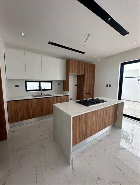 Cocina equipada con isla tipo cascada en cuarzo, backsplash decorativo, fregadero europeo empotrado y mezcladora europea en acero inoxidable