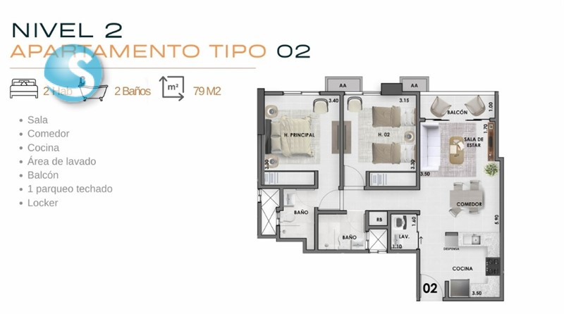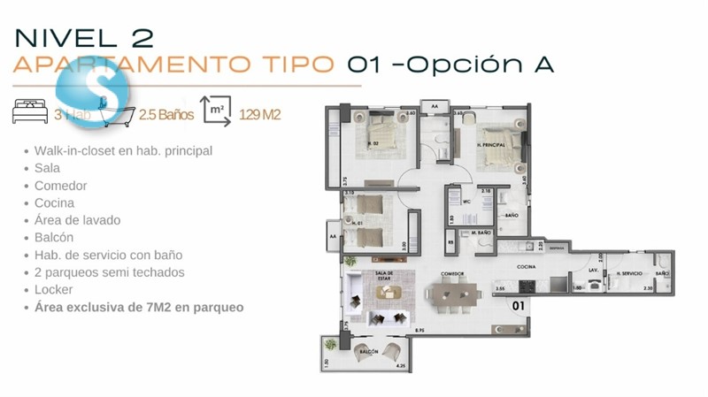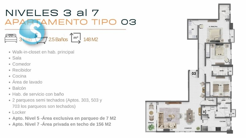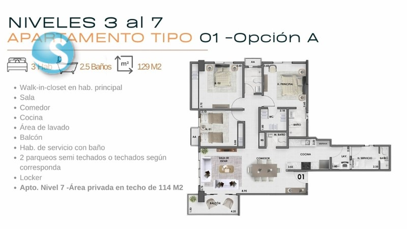 - tenemos aptos. de 79mts. a 155mts.: de 2 habs. con 2 o 2 ½ baños y de 3 habs. con 2 ½ baños, todas con balcón y locker, los aptos. están del 2do. al 6to. nivel, tienen 1 y 2 parqueos, algunos aptos. tienen walk in closet en hab. principal y hab. de servicio con baño.