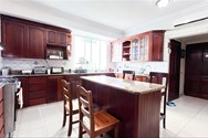 Cocina modular en caoba, con desayunador y meseta de granito natural.