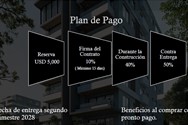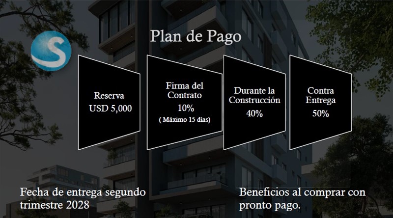 Exclusivo proyecto de apartamentos ubicado en la zona de Evaristo Morales, consta de 2 niveles de parqueos y siete niveles de apartamentos y en el octavo nivel el área social con vista espectacular a la ciudad de Santo Domingo