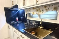 - Cocina con gabinetes superiores e inferiores, tope de marmolite y fregadero de acero inoxidable.