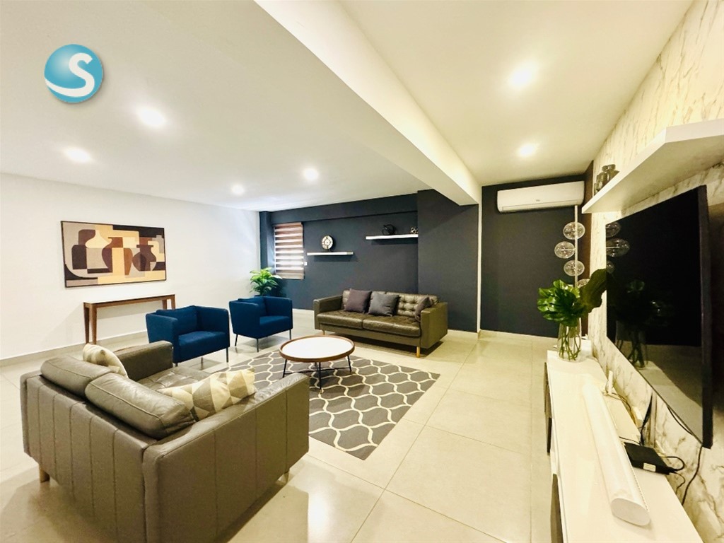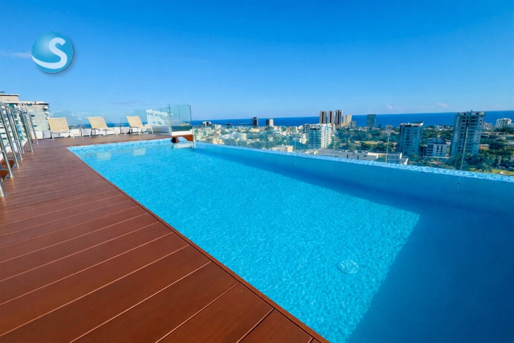 El apartamento ofrece una distribución elegante y funcional, con balcón frontal y vista abierta al mar, ideal para disfrutar del atardecer. Cuenta con 2 habitaciones, cada una con baño privado y walking closet, además de baño de visitas y un estudio perfecto para home office.