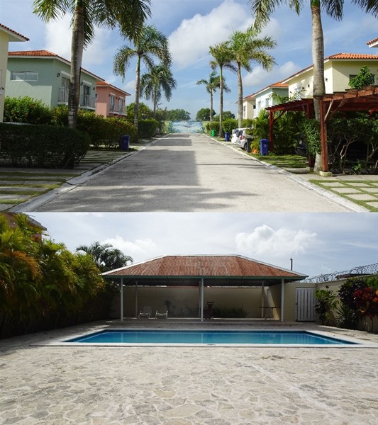 Marquesina abierta con parqueo para 2 vehículos. Piscina común.