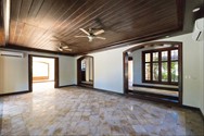 Como piso en mármol rustico pulido y escalera de madera brasileño.