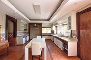 Cocina equipada con isla y desayunador externo con vista a la piscina