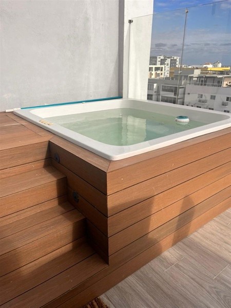 - Acceso al área común con sala, terraza con jacuzzi y habitación con baño y walking closet