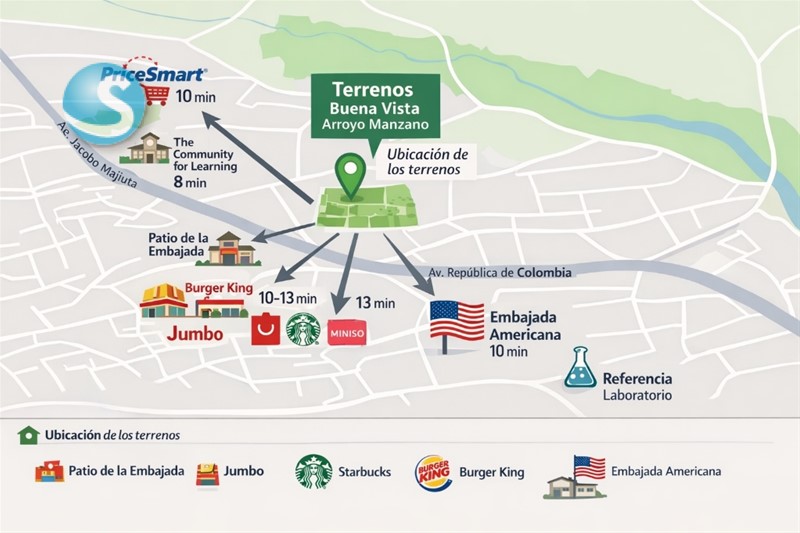 Uno de los grandes atractivos de esta ubicación es su conectividad con importantes puntos de referencia, todos a tiempos estimados de aproximadamente 10 minutos en vehículo. Entre ellos destacan PriceSmart, Community for Learning, el Patio de la Embajada, plaza comercial que integra Jumbo, Starbucks, Burger King, Miniso y el Laboratorio de Referencia entre otros comercios. De igual forma, la Embajada Americana se encuentra a una distancia similar, lo que añade valor institucional y comercial al entorno.