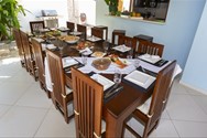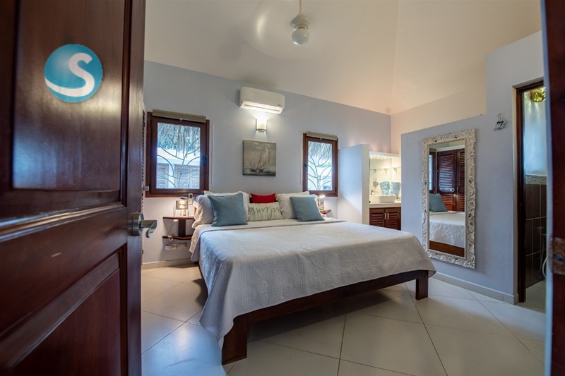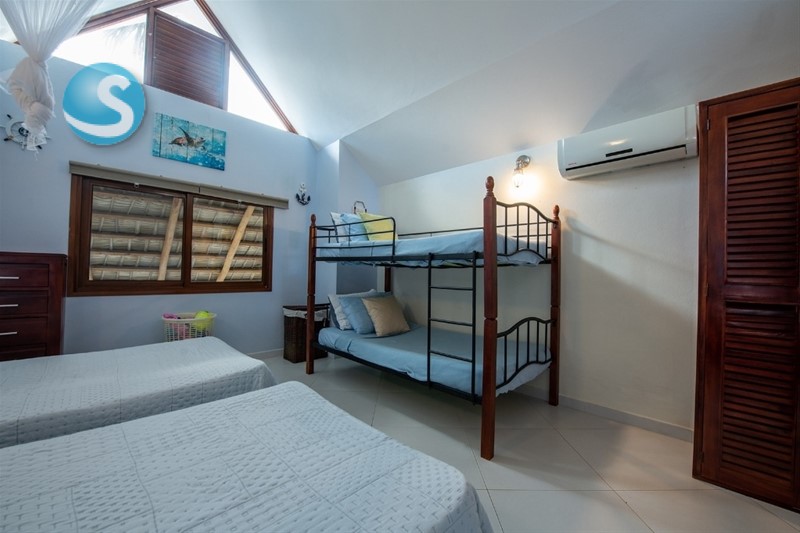 4 habitaciones con baño completo cada una, y un baño adicional afuera. Una habitación