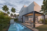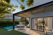 Villa de 200 m² (terrenos aprox. 279.07–416.26 m²), con estudio; opciones de pergolado, piscina, baño de jardín y módulo BBQ.