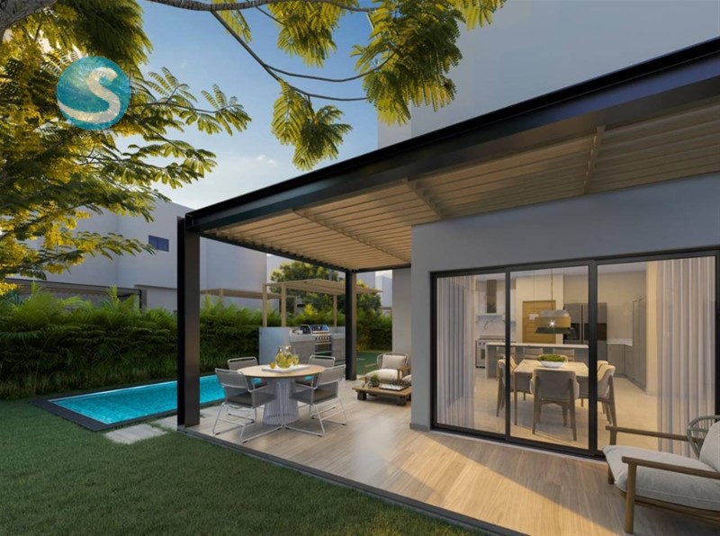 Villa de 232 m² (terrenos aprox. 300.23–416.26 m²), con habitación de servicio con baño, locker y opciones de pergolado, piscina, baño de jardín y módulo BBQ.