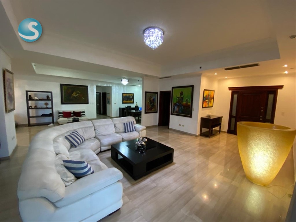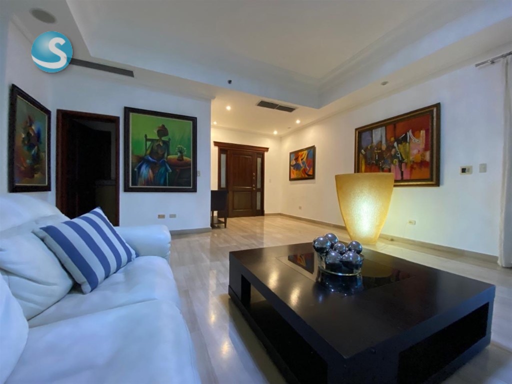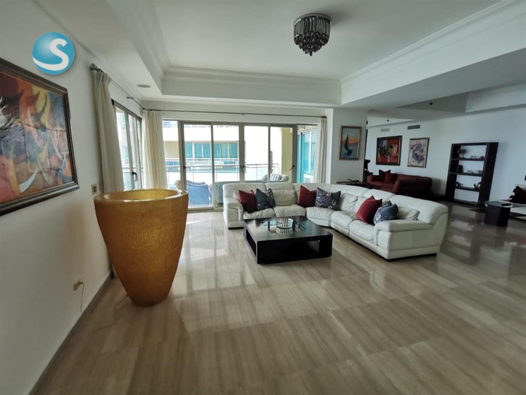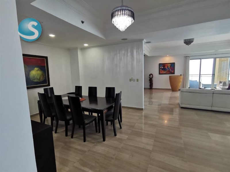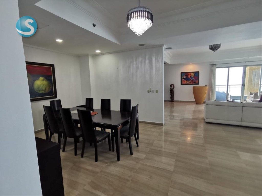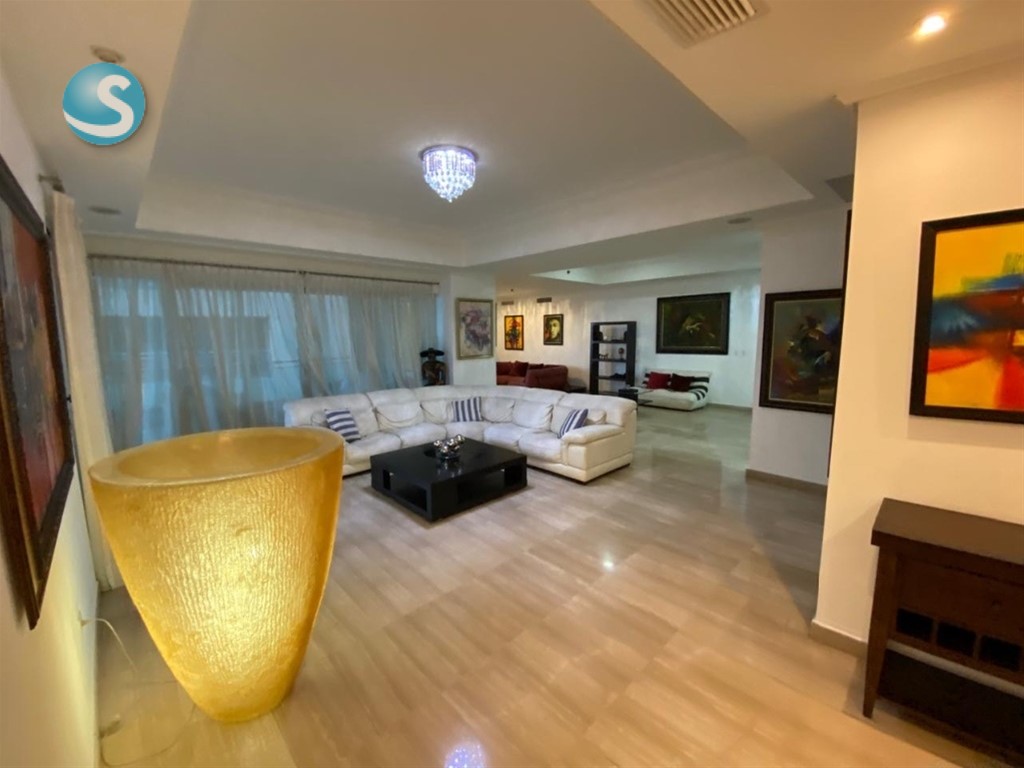 Ubicado en un piso 28, este apartamento cuenta con 335 metros cuadrados y una impresionante vista aérea de 360 grados, ofreciendo espacios amplios, luminosos y perfectamente distribuidos. Dispone de dos salas, comedor, cocina, tres habitaciones, cada una con baño privado y walk-in closet, además de cuarto de servicio con baño y área de lavado.