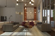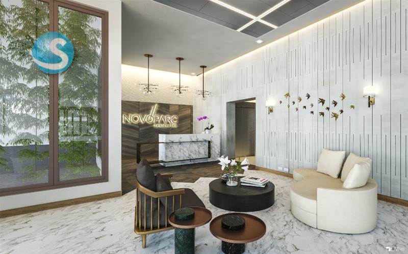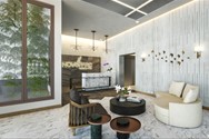 Amplio lobby amueblado por cada torre. Diseñado y decorado por Diptic Design.