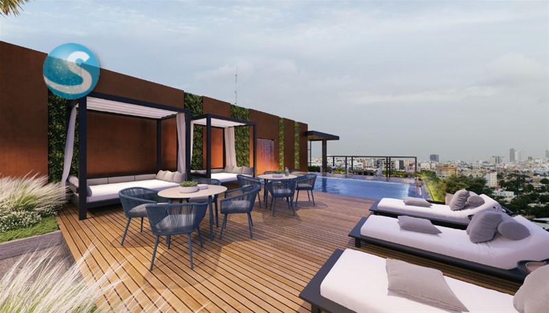 En el nivel 16 de la torre estará el área social del proyecto que tendra: piscina infinity, gimnasio equipado, terrazas destechadas, salón multiuso, área de juegos para niños y BBQ.