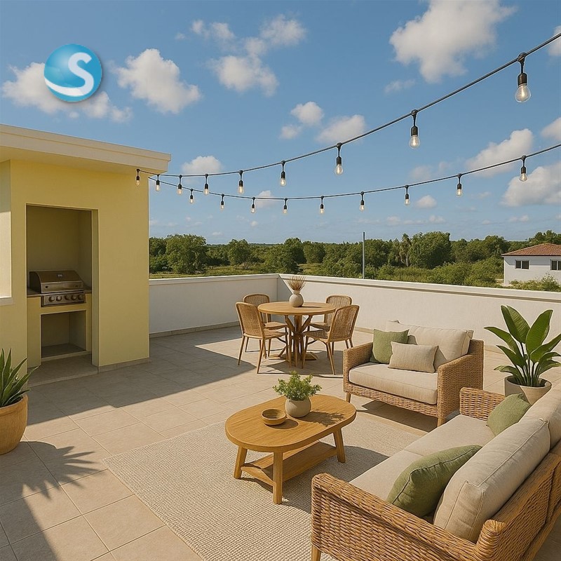 Segundo piso: tres habitaciones, principal con barcon y terraza familiar, working close y baño independiente. 2 habitaciones secundaria con baño comun, Toda la azotea disposable con escalera por dentro de la casa. Frente a un parque.